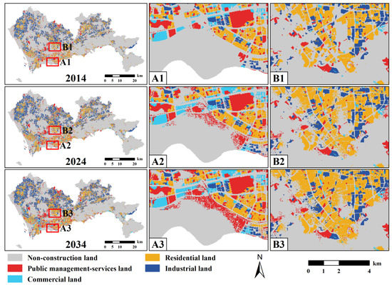 We coupled the FLUS model and the building height prediction model to simulate urban land use change in the horizontal direction and building height growth in the vertical direction. Figure 11 shows the simulated urban land use patterns of Shenzhen in the horizontal direction for 2024 and 2034. Shenzhen had a large amount of non-construction land that was continuously eroded by urban land. The area (A1, A2, A3) near Shenzhen Bay is an economically developed central area in Shenzhen. The future urban land in this area is expanding rapidly, with strong growth in public management services and commercial land to fulfil the needs of future economic development. In the area (B1, B2, B3) near the Shenzhen North Railway Station in the south of Longhua District, much non-construction land was developed as residential land. Transportation convenience due to railway stations promotes the expansion of urban land.