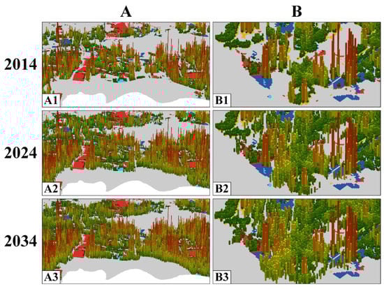 Predicted results of building height growth of Shenzhen in the vertical direction, 2014–2034. (A) The region near Shenzhen Bay; (B) The region near the Shenzhen North Railway Station in the south of Longhua District; (A1–A3) represent the predicted results of building height growth of region A in 2014, 2024 and 2034; (B1–B3) represent the predicted results of building height growth of region B in 2014, 2024 and 2034.