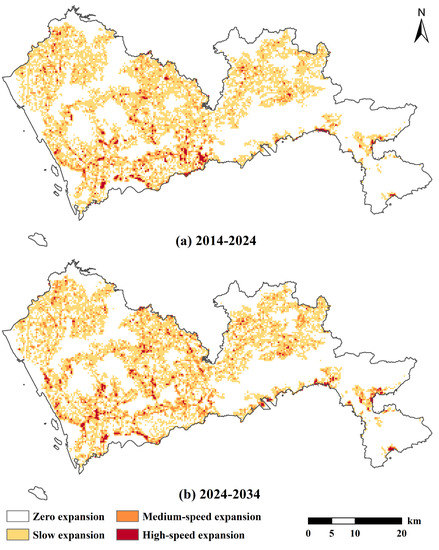 The spatial distribution of urban 3D expansion intensity in Shenzhen from 2014 to 2034 is shown in Figure 13. The distribution of expansion intensity in Shenzhen was consistent in 2014–2024 and 2024–2034. Shenzhen was characterized mainly by low-speed expansion. Expansions occurred in all areas except mountainous areas. High-speed expansion was mainly concentrated in the southern downtown and economically developed areas. Areas of high-speed expansion from 2014 to 2024 were mainly concentrated in eastern Luohu, Futian Nanshan, and Longhua. The expansion intensity from 2024 to 2034 changed slightly. The intensity of Dapeng and northern Shenzhen increased. By contrast, the intensity of the northern city center slightly decreased, especially in the southern part of Luohu, which had high-speed and medium-speed expansion and later shifted to medium- and low-speed expansion. The central of Nanshan and Baoan showed a slight increase in intensity and high-speed areas. The high-speed expansion area of Dapeng increased slightly.