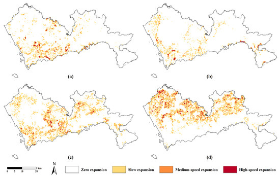 Grid analysis is a spatial measurement method that calculates each grid within the study area by arranging uniform grids in the entire area and using such grids as the basic unit to reflect the spatial heterogeneity of urban expansion [49]. We selected a 300 m × 300 m grid to cover the study area and used it to calculate the urban 3D expansion intensity index within each grid. We used the natural fracture method to divide the index into four levels: high-speed expansion, medium-speed expansion, slow expansion, and zero expansion.