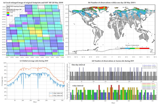 However, the TROPOMI SIF still has spatiotemporal limitations when generated at high resolutions (e.g., 0.05°, 1-day or 2-day interval). First, the size of TROPOMI sampling footprint is varied across track. It approaches to 0.05° (denoting the size in both latitude and longitude in this study) when at nadir, and frequently is larger than 0.05° when away from the nadir. Figure 1a displays an enlarged image of one region far away from the nadir for example. Referring to [22], each grid cell is the average of those footprints covering the center of this grid. The size of TROPOMI footprints (black solid frames) are 2–3 times larger than the 0.05° grids (gray dotted frames). In this case, the composite 0.05° SIF cannot achieve the real expected resolution, which contains large uncertainties in heterogeneous area. Second, the TROPOMI SIF has remarkable discontinuities at 1-day or 2-day scales. Lots of blank terrestrial areas exist within one day due to the swath gaps and thick clouds (Figure 1b), which results in a global coverage of less than 75% and 88%, respectively, within one day and two days during 2019 (Figure 1c). Meanwhile, the resulting temporal gaps are also noteworthy. Taking the Aurora site in north America (42.7228°N, 76.6628°W) for an example, almost a half and a quarter of the one-day and two-day periods during 2019 have none valid observations (see the upper subgraph of Figure 1d). Even at 4-day scales, the gaps are still present and more than half of the 4-day periods have less than two observations. Note that, cloudy-sky SIF retrievals are retained (cloudy fraction less than 0.8) and no screening of observation numbers for data averaging is conducted in this original SIF (called TROSIF005 in this study). With more strict screening of cloudy fraction and observation numbers to reduce the noises, the valid cells will have a huge decrease.