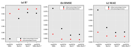 To determine the explanatory variables involved in modeling, we explored how the model accuracy was affected by the selection of explanatory variables. Figure 3 shows the statistical metrics of model accuracy for eight combinations of explanatory variables based on the testing samples in 2019. On one hand, adding the meteorological factors to the explanatory variables can significantly improve the performance of model with higher R2, lower RMSE, and MAE values. On the other hand, for vegetation optical and structural related variables, the single use of NIRV (the first case in axis) produced the lowest accuracy, whereas using seven reflectance bands or the first four bands instead of NIRv (the second and third cases in axis) performed better, both with and without meteorological factors. In addition, substituting the first two of the seven bands with NIRv (the fourth case in axis) did not result in an obvious improvement in the statistical metrics, probably because they contained similar information. Note that the performances of the last three cases had no significant differences with a small range of R2 (0.927–0.929), RMSE (0.059–0.060), and MAE (0.042–0.043) when adding the meteorological factors. Therefore, to reduce the complexity of the model features, we selected the second case (eight variables including cos(SZA), the first four reflectance bands, Ta, VPD, and NDWI) as the final explanatory variables for further model development and analysis in this work.