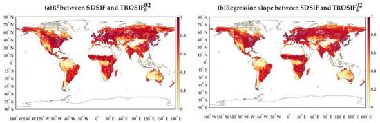The pixel-wise correlations between day-to-day SIF values from SDSIF and in 2019 at 0.2°, daily scales in terms of the coefficient of determination (R2) (a) and regression slope (b). All pixels in this figure achieved the significance level of 0.05.
