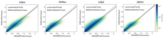 Additionally, the quantitative assessment of the consistency between these two products (Figure 7) further verified that the SDSIF can well preserve the spatial variability of the original SIF, with high spatial correlations between them two: the scatters fell on closely to the 1:1 line with the R2 larger than 0.890 and the RMSE less than 0.072 mW/m2/nm/sr for all four months in 2019.