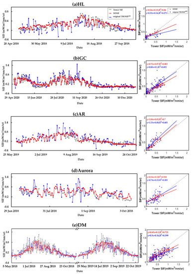 Comparison between the time series of tower-based SIF and the two satellite SIF products (SDSIF and original TROSIF005) at daily scale for (a–e) sites. All regressions in the right panel achieved the significance level of 0.05.