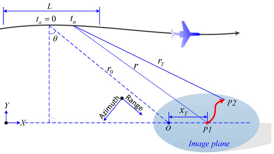 Figure 1 shows the high-squint SAR geometry containing one moving target. The platform carrying the SAR sensor flies along a straight line parallel with the X-axis with a constant velocity v. The squint angle of the beam center line is , and the operational range from the aperture center to the scene center o is . Suppose that a target with azimuth distance moves from position P1 to P2 during the CPI. It is hard to determine the target motion information, since no prior knowledge is available. For example, the moving target may have a constant velocity, acceleration, or time-varying motion parameters. In general, the along-track motion is denoted by vector , and the cross-track one is defined as . Both and contain velocity, acceleration, and high-order motion parameters. As a result, the slant range of the moving target at a slow time can be expressed by: