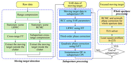 Ground moving target imaging (GMTIm) mainly contains two processing steps: moving target detection and motion parameter estimation. Moving target detection can significantly improve the target signal-to-noise ratio (SNR) and benefits the subsequent motion parameter estimation. For the target located at the high band of the pulse repetition frequency (PRF), it can be separated from the clutter spectrum in the range–Doppler domain [14]. If the target is submerged by the clutter spectrum, the target energy may be extracted in the image domain [14]. However, if the target is seriously blurred, high SNR data of the moving target can hardly be achieved by windowing the blurred energy in the image domain. To deal with such a problem, this paper utilized multiple low-resolution subaperture images for moving target detection. In different subaperture images, the stationary clutter is nearly unchanged, while the moving target blur gradually varies over a slow time. In this paper, the dominant blur of the moving target was extracted from each subaperture image and transferred back to the raw data domain. By combining the moving target signal from multiple subapertures together, one can obtain the target signal of the whole CPI with a high SNR.