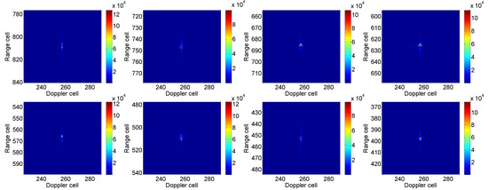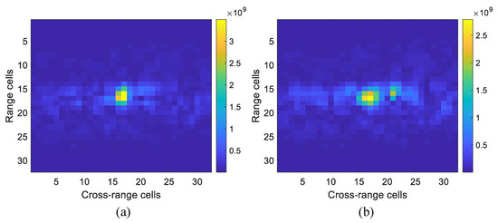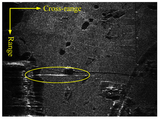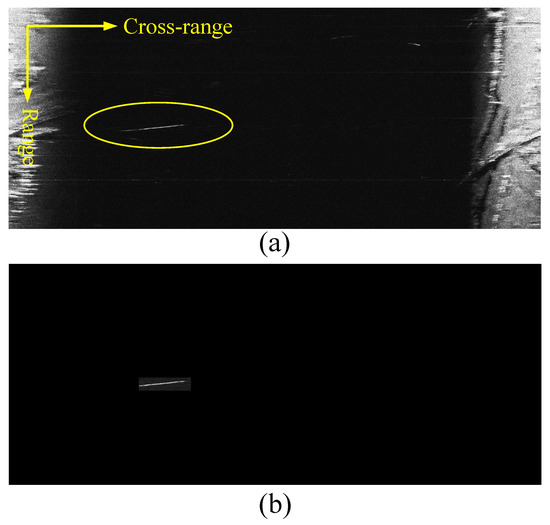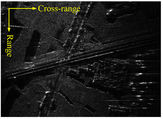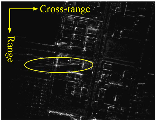 Target T1 is located at the high band of the PRF, as shown in Figure 6a, which denotes the range–Doppler domain after the LRWC for the stationary scene. Then, the target detection is performed in the range–Doppler domain by windowing the dominant blur of the moving target, as shown in Figure 6b. The corresponding image of the stationary scene is given in Figure 7, where the blur of the moving target cannot be found.