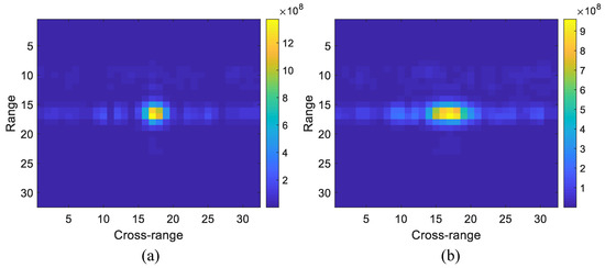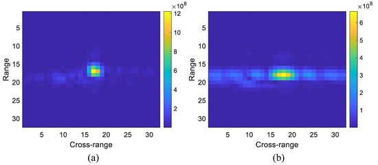 After the LRWC for the stationary scene, the envelope of T1 is plotted in Figure 8a. It can be seen that the moving target had serious range cell migration, which indicated that T1 had a large radial velocity. Using the proposed HPC-GMTIm algorithm, the envelope of T1 was confined into one range cell after the RCMC, as illustrated in Figure 8b. T1 can be focused after azimuth high-order phase correction, which is shown in Figure 9a. In the GHHAF method, by contrast, the moving target was still defocused, as given in Figure 9b. The reason for the failure of the GHHAF method was that the high-order phase terms were not estimated and corrected.