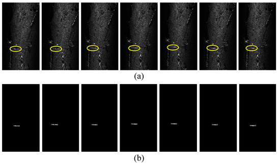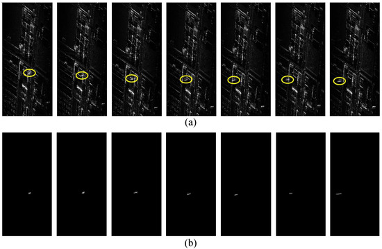 Moving target detection for T4. (a) Subaperture images before detection. (b) Subaperture images after detection.