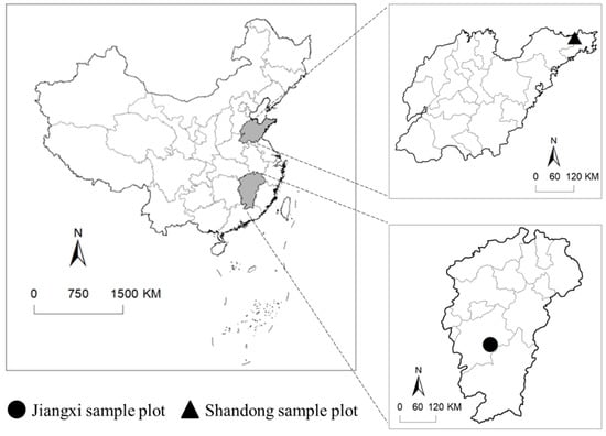 The location of study area and the field sample plots. The dot and triangle represent Jiangxi sample plot and Shandong sample plot, respectively.