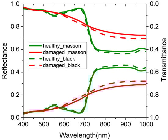 The reflectance and transmittance of healthy and damaged needles of masson pine and black pine.