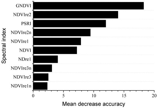 The variable importance of the 10 spectral indices of the RF model using MDA is shown in Figure 6. GNDVI suggests the most contribution to the IAR prediction, which is followed by NDVIre2 and PSRI. The rank of importance reveals the fact that the retrieving model was affected by the synergy of spectral indices established by green, red, red-edge and near-infrared bands.