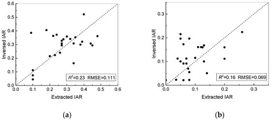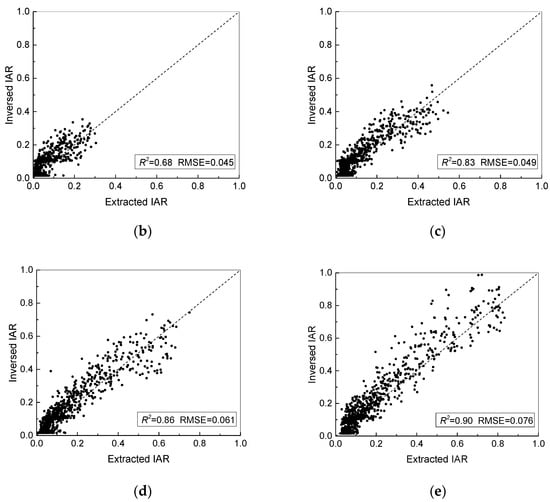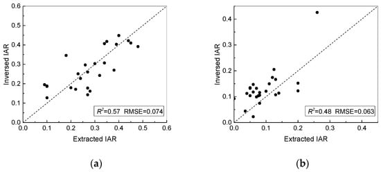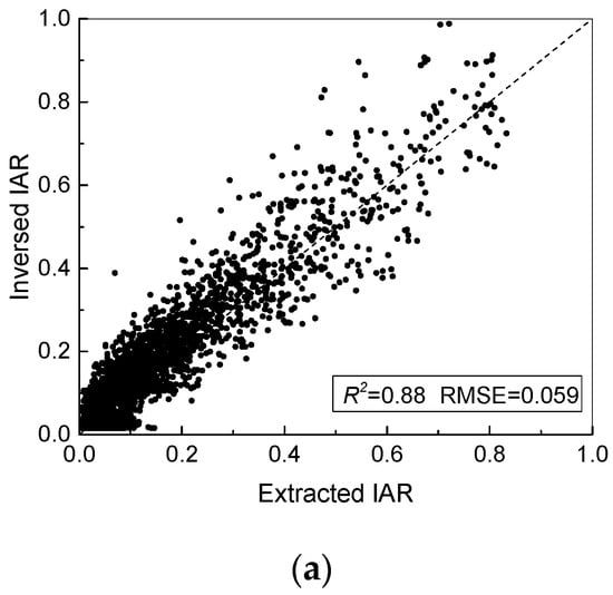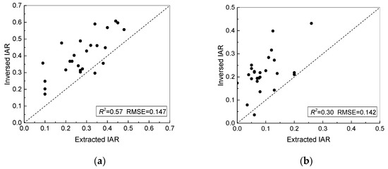 The inversion results of Jiangxi and Shandong plots are shown in Figure 8. The R2 between the retrieved values and the extracted values are 0.57 and 0.48, respectively. The retrieval performance differs within the two study sites. Higher IAR values were retrieved as well as extracted for the Jiangxi plots than the Shandong plots (Figure 8).