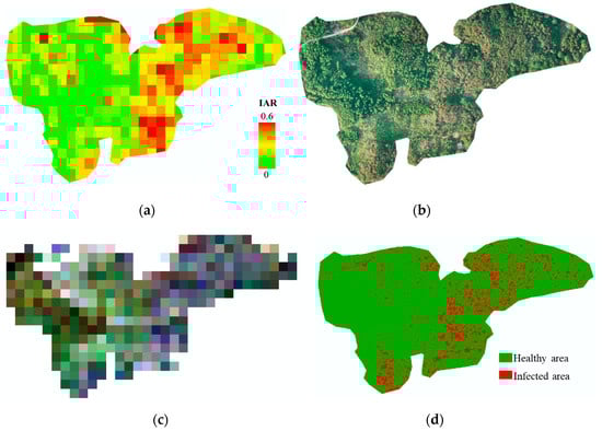 Infected area map of typical region of masson pine trees. (a) The 30 m-resolution IAR map. (b) The corresponding UAV RGB image. (c) The corresponding Sentinel-2 RGB image. (d) The reference classification results from the UAV image.