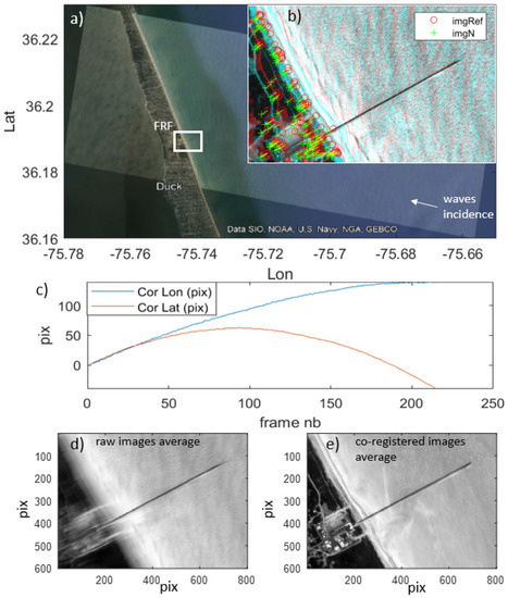 (a) Jilin video acquisition viewfield at Duck (USA) on 7 June 2020 with (b) an inset illustrating the co-registration between the first and last frame of the sequence using a spatial correlator. Red and green symbols stand for the captured displacement of homologous points. (c) Co-registration of images in the sequence (with reference the first image) showing the drift in Longitude and Latitude over time. (d,e) are the raw and co-registered image averages. The Jilin video sequence was obtained from a CG Satellite in 2020 (Distribution CG), acquired within the framework of a CNES agreement.