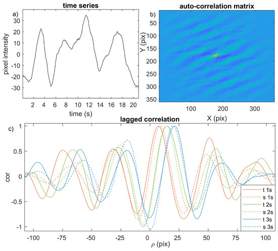 Principle of the method employed. (a) Pixel intensity anomaly timeseries, (b) matrix of lagged correlation (at = 3 s), and (c) lagged correlation along the peak direction (in the Radon sinogram in polar space), with the radius from the center of the computation window and different from 1 s to 3 s for the temporal and spatial versions.