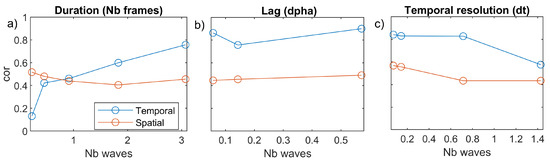 Sensitivity analysis of the temporal (blue) and spatial (red) versions of the correlation method to parameters: (a) to the number of frames in the video duration (here in terms of number of seen waves of a 7 s period, from 3 to 215 frames); (b) to the lag given to the waves to propagate (here in terms of a 7 s wave period, from 0.4 s, to 1 s, 4 s, and 10 s); and (c) to the temporal resolution dt (here in terms of a 7 s wave period).