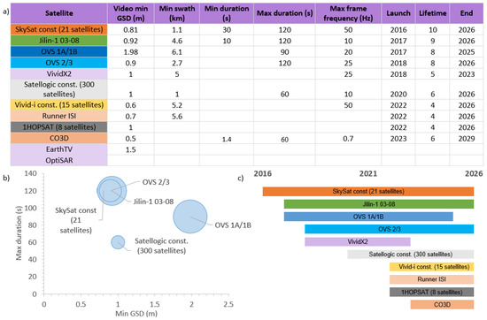 A review of current and future satellite video missions. Table and graphics showing the main optical video mission characteristics and lifetime, with some video duration versus ground sampling distance (GSD). (b,c) Present missions only from all the missions in (a). This table may contain incomplete and outdated information. Updated documentation can be found on satellite mission web pages.