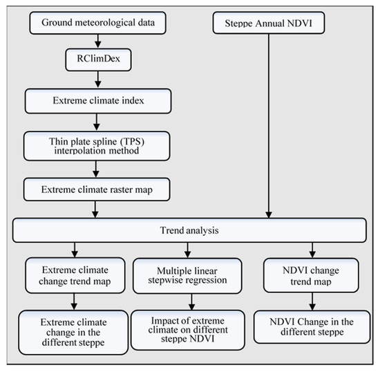 Algorithm flowchart for determining the influence of extreme climate on different steppe areas. NDVI, normalized difference vegetation index.