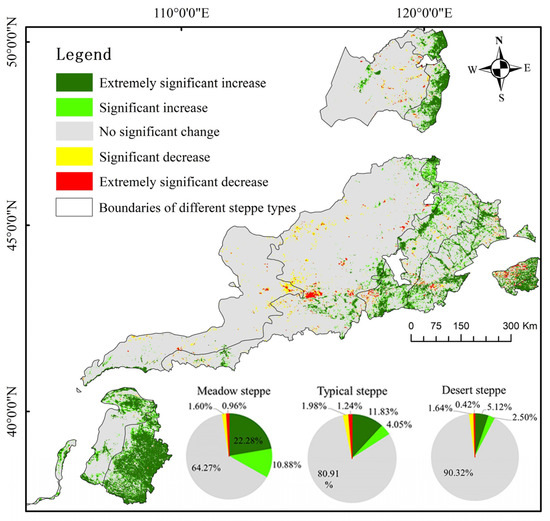 From 1998 to 2017, the spatiotemporal variation in steppe NDVIs both increased and decreased by area; however, the overall trend was of an increase. In particular, the NDVI increased significantly in the east, northeast, and southwest of the study area (i.e., the northeast meadow steppe and typical steppe in the southwest), while it decreased significantly in central and eastern areas. The NDVI area of meadow steppe increased the most, accounting for 33.10% of the whole meadow steppe area, with an extremely significant increase of 22.28% and a significant increase of 10.88%; only 2.54% of the area saw a decrease. The NDVI area of typical steppe increased by 12.28% overall, with an extremely significant increase accounting for 11.83% and a significant increase of 4.05%; only 3.22% of the area saw a decrease. Compared with the other two steppe types, the increase in desert steppe NDVI accounted for a smaller proportion (7.62% in total), and 2.06% of the area saw a decrease (Figure 3).
