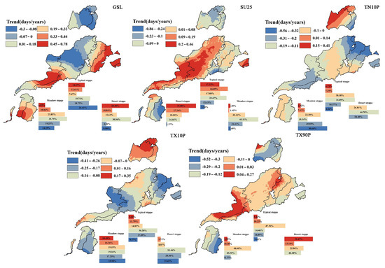 Spatial distribution of extreme temperature change in different steppe areas of Inner Mongolia from 1998 to 2017. Indices: GSL, growing season length; SU25, summer days; TN10P, cool nights; TX10P, cool days; TX90P, warm days.