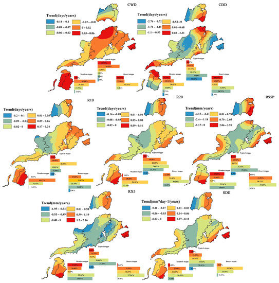 Spatial distribution of extreme precipitation trends in the different steppe areas of Inner Mongolia from 1998 to 2017. Indices: CDD, consecutive dry days; CWD, consecutive wet days; R10, number of heavy precipitation days; R20, number of very heavy precipitation days; R95P, very wet days; RX5, max 5-day precipitation amount; SDII, simple daily intensity index.