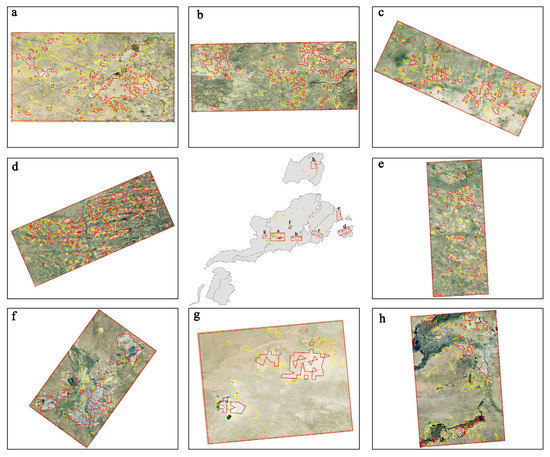 Google Earth images from 2017 showing the normalized difference vegetation index (NDVI) degraded area. (a–h) show typical areas of significant degradation, where red and yellow lines represent extremely significantly degraded and significantly degraded areas, respectively.