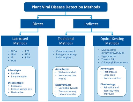 Indirect methods that assess the plant response include traditional methods to detect virus symptoms visually in the field and novel approaches to assess the altered phenotype using optical sensors. The key advantages of these three major detection methods are related to reliability and the ability to provide efficient sampling (Figure 1).
