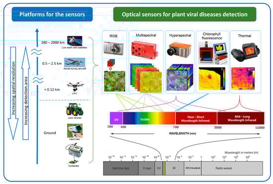 At the finest scale, optical sensors can be used directly on contact on leaves, proximally on ground vehicles and hand-held. Some non-imaging sensors like chlorophyll fluorimeter, GreenSeeker, laser thermometer, and spectroradiometer are usually used proximally or directly in contract with the leaf [77]. By increasing the sensing distance, imaging sensors can be used proximally (e.g., mounted on tractors) or remotely (e.g., airborne platforms such as unmanned aerial vehicles (UAV), airplanes, and satellites) to support regional disease management [78]. Generally, increasing sensing distance results in decreasing spatial resolution. Satellite images provide the broadest land coverage but have the lowest spatial resolution. Manned airplanes can capture higher spatial resolution in a moderate area compared to satellite images. UAVs or drones can carry light-weight optical sensors flying as low as a few meters above ground [79,80,81], potentially providing millimetre spatial resolution images for plant viral disease detection.