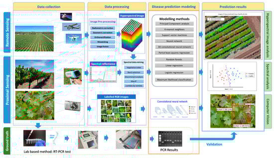 The pipeline for optical disease detection includes data collection, data processing, modelling, and ground-truthing (Figure 3). Different data imply different processing and modelling needs ranging from statistics to machine learning [129,130]. Below, we describe some commonly used methods in plant viral disease modelling.