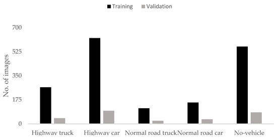 In this section, we demonstrated four approaches for comparisons, including Haar features, YOLOv4(I), YOLOv4(II), and YOLOv4(III). This study used a front-camera device, which is based on 1280(H) × 960(V) with NIR LED lighting installed in front of large vehicles to collect the front-vehicle videos from the car kits. The traditional Haar feature method used the trained Car.xml, and the original YOLOv4 used the test-dev2017 dataset from MS COCO website. In Figure 4, the collected large vehicle data included 1994 images that choose 86.26% for training and 13.74% for validation. The type of front images included a highway truck, highway car, normal truck, normal car, and no-vehicle images, which were available data we collected. Using Haar features, the scopes of x, y, w, and h were adjusted to avoid false detection, and the labeling was used for YOLOv4 before the training process. YOLOv4 has a useful tool, LabelImg [57], to manually annotate the images. The number videos and images continually increases, but we generally did not redo the training model since the training takes time. We proposed that YOLOv4 with the fence method can be used to detect the front vehicle under limited videos or images.