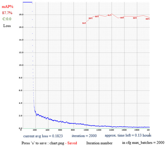 For the training process, we used a desktop PC running Microsoft Windows 10, with an Intel Core i7-11800H CPU at 2.30 GHZ, 16 GB of RAM, and NVIDIA GeForce RTX 3070 Laptop with a high-performance graphic processing unit (GPU). This study used Python programming language for development. The object detection usually adopts mean average precision (mAP) for measuring the accuracy. The loss function from YOLOv4 definition is the sum of complete intersection over union, confidence, and class losses [54]. Figure 6 showed mAP% is 87.7% in the loss chart for the collected data file (YOLOv4_largevehicle.cfg) and the average loss is 0.1823 using max 2000 batches.