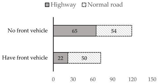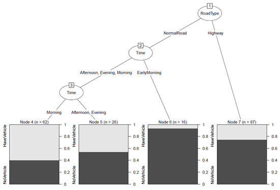 The collected 191 videos were from large trucks, as shown in Figure 7. The negative (no front vehicle or NoVehicle) data are more than positive (have front vehicle or HaveVehicle) data, especially on the highways. Generally, there are many traffic lights on normal roads. The videos of large trucks have a lot of chances to have front vehicles. Since the highway samples had 119 non-front vehicles, their s were zeros. The working time of large trucks is different to that of ordinary vehicles, and most of the driving time is concentrated in the morning. Early morning had fewer front vehicles. Unlike ordinary vehicles, a very serious accident will result from being hit by a large vehicle. Drivers usually stay away from large vehicles. Fewer vehicles drive in front of large vehicles, especially on the highway. The drivers seem to stay away from large vehicles to keep a greater distance for safety. We observed detailed road and time factors for discussion using a classification method based on supervised learning. This study can use a decision tree to obtain the relation of front vehicles between road type and time. Decision tree is a popular tool from machine learning for classification. This study used R programming [58] and employed Recursive Partitioning and Regression Trees (rpart) [59] from the Classification and Regression Trees (CART) algorithm, and the toolkit partykit [60] can be used for displaying CART tree visualization. For verifying the study, Figure 8 shows the result from 191 videos using the rpart and partykit packages, of which the highway and early morning on normal roads had high non-vehicle rates.