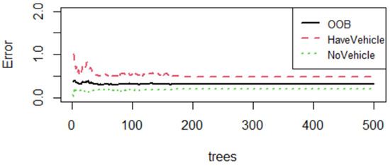 This paper also adopted random forests, which is a classifier that combines multiple decision trees to make predictions, and the result was obtained using randomForest package [61]. Out-of-bag (OOB) score is used to validate the model. In Figure 9, the OOB error rate is 0.3141. Based on Figure 7, HaveVehicle had higher errors since this study did not have much collected positive data. Therefore, the result showed that random forests obtained large errors under limited data. Since decision tree and random forests belong to shallow learning, this study will use deep learning to handle complex classification and detection problems.