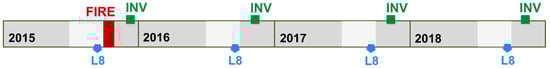 Landsat-8 Operational Land Imager (OLI) surface reflectance (SR) images (30m-grid) [53]—available in the Google Earth Engine (GEE) data catalog (Collection 1, Tier 1) [54]—were used to calculate post-fire changes in spectral indices. We followed the methods of [55] and used the GEE cloud computing platform for selecting Landsat-8 SR images (bands 1–7) with less than 30% of cloud coverage; eliminating cloud and shadow areas based on the OLI Quality Assessment band. In these steps, we processed images from August to September for 2015 to 2018 (Figure 2), except 2016, which also included one image of early October. We then applied a Linear Spectral Mixing Model (LSMM) [56], called spectral unmixing in GEE [57], to model the spectrum of each pixel from the Landsat-8 images as a linear combination of three targets (NPV, GV, and Shade), minimizing the sum of squared errors, as described in general terms by this equation