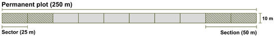 Outline of a permanent plot (250 × 10 m), divided into 10 sectors (25 × 10 m). Initial and final sections (50 × 10 m) are the hatched sectors.
