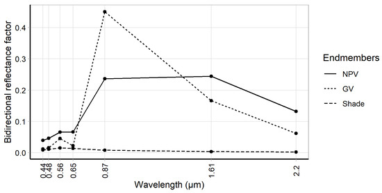 Spectral response of each reference target (endmembers) used in the spectral unmixing in Google Earth Engine. Bidirectional reflectance factors were retrieved from a Landsat-8 (OLI) surface reflectance image of September 2016. Selected pixels were in the same Landsat scene and nearby our field plots. Each specified wavelength (x-axis) represents the center of the OLI bands 1–7, respectively.