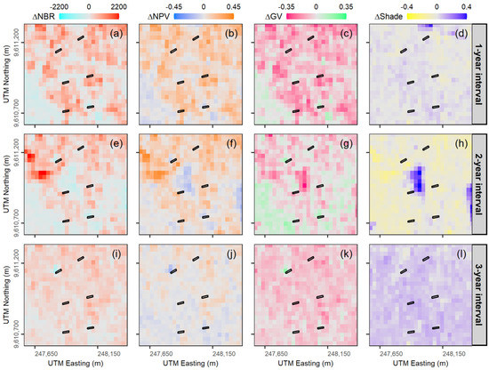 Demonstration of the absolute temporal changes (∆) in each index (NBR, NPV, GV, and Shade) relative to the pre-fire image mosaic (2015), accumulated in three increasing temporal intervals: 1-year (a–d), 2-year (e–h), and 3-year interval (i–l). The areas in black indicate six sections (50 × 10 m) of burned permanent plots (250 × 10 m) measured in the field.