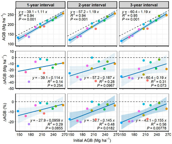 Plot-level relationships between the initial aboveground biomass (AGB) (x-axes) and the remaining post-fire AGB, absolute change (∆), and percentage of change (∆%) (y-axes), accumulated in three increasing temporal intervals (columns). Initial AGB was sampled at ~2 months after the fire and the remaining AGB was registered at one, two, and three years after the fire. Each plot received the same color in all subfigures to facilitate tracking their temporal behavior. Dashed lines are references for no change. Shaded backgrounds represent 95% confidence intervals, of which transparency levels highlight significant regressions in dark blue (p ≤ 0.05) and regressions with marginal significance in light blue (0.1 ≥ p > 0.05).