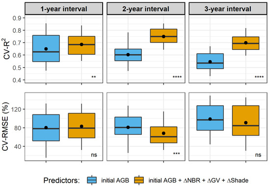 Cross-validation (CV) performance of the single models and full Random Forest models used for predicting the post-fire AGB loss in three increasing accumulated temporal intervals. Performance metrics include the R2 and RMSE from the 100 model runs for each dataset. Dots represent average values. Symbols and letters indicate significance levels of statistical differences between predictor groups according to unpaired Wilcoxon tests: ns (p > 0.05), ** (p ≤ 0.01), *** (p ≤ 0.001), and **** (p ≤ 0.0001).