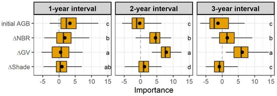 Absolute importance (x-axes) of the four variables (y-axes) used in the full Random Forest models in each accumulated post-fire temporal interval to predict the post-fire AGB loss in three increasing temporal intervals. Common characters identify the variables with similar average importance according to multiple pairwise Tukey’s tests.