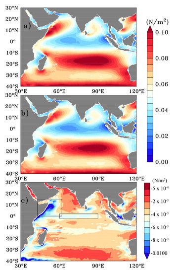 The annual means of the wind stress with (τCur) and without (τno-Cur) currents in the Indian Ocean and the difference between the two are presented in Figure 1. The striking feature in the wind stress pattern in both the estimations is over the south-east trade winds, which occur south of 10° S and persist throughout the year in the Indian Ocean [23]. An overall basin-wide reduction in the wind stress can be seen by including currents into the wind stress equation (Figure 1c).