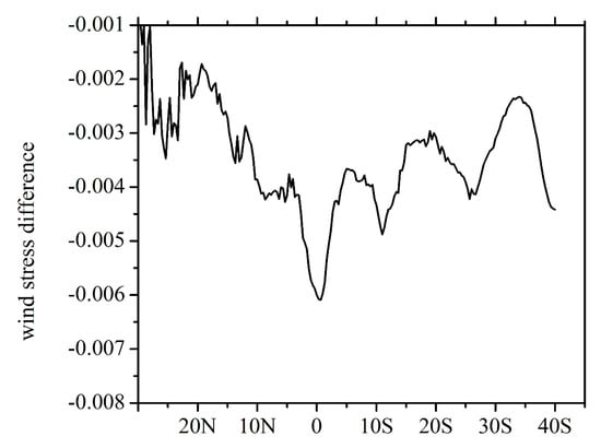 The zonal average of the wind stress difference (Figure 2) shows that the highest deviation occurs along the equatorial Indian Ocean around 2° N. This large difference at 2° N is because of the large stress difference along 2° N as shown in Figure 1c. Since the currents are stronger in this region [22,23], the difference is also larger. Table 1 summarizes the differences between τno-Cur and τCur fields for the whole study region as well as for the regions of Somali current and Equatorial Jets. It is noted that by including surface currents into the wind stress computation, the basin-wise averaged wind stress decreased by 5.8%. Notable differences in the percentage reduction of wind stress exist when surface currents are accounted for Somali current region (−9.56%) and Equatorial Jet region (−15.93%).