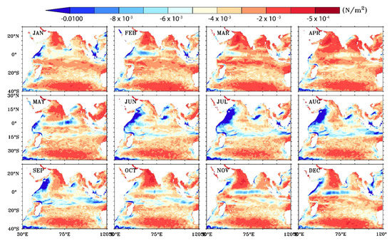 Monthly spatial variation of the difference between two wind stress estimations (τCur − τno-Cur) averaged over 2007–2020.