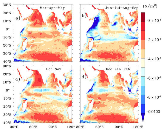 Seasonal and spatial distribution of the difference between the two wind stress estimations (τCur − τno-Cur) averaged over 2007–2020. (a) Spring season (March–May), (b) Summer monsoon season (June–Sepetember), (c) Autumn season (October–November), (d) Winter monsoon season (December–February).