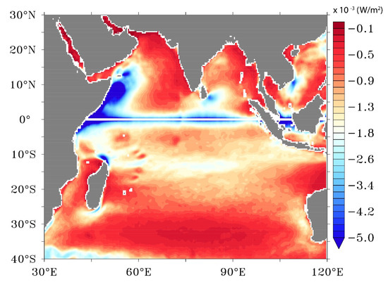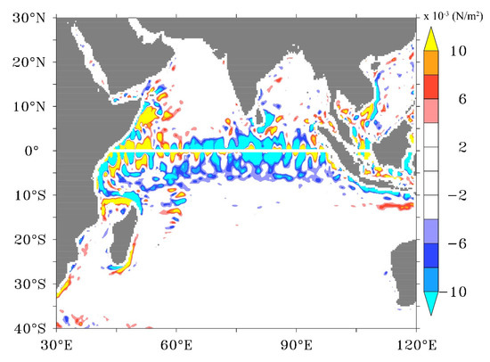 where x and y are eastward and northward coordinates and τx and τy are the corresponding components of the wind stress. Wind stress curls are estimated using τCur and τno-Cur and the difference between the two is illustrated in Figure 5 on an annual basis. On a large scale, the wind stress curl field over much of the Indian Ocean is very similar in τCur and τno-Cur estimations. The inclusion of surface current feedback modulates the wind stress curl more along the equatorial Indian Ocean, Somali region, a coastal region along with the Southwest Arabian Sea, etc. The largest difference in the wind stress curl is exhibited along the equatorial Indian Ocean and the Somali region, which are the permanent upwelling systems in the Indian Ocean [23,24]. A maximum positive difference is present in the Somali and the western Equatorial Indian Ocean, while the least was present in the central Equatorial Indian Ocean.