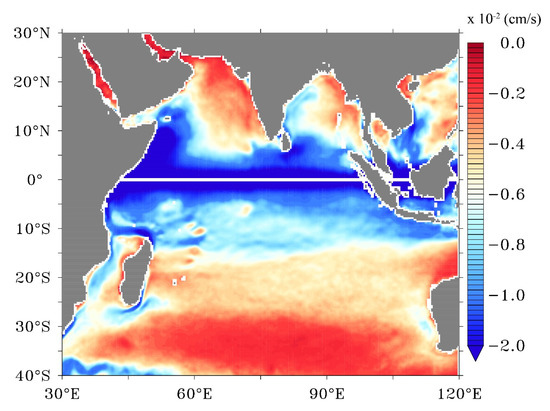 where is the density of sea water, A is the eddy viscosity (10−2 m2/s), f is the coriolis parameter, and τ is the wind stress computed without and with the inclusion of surface currents using Equations (1) and (2), respectively. The difference between the two estimations of Ekman currents is shown in Figure 6. Ekman currents are reduced along major portions of the region of study after incorporating the current effect. The weakening of Ekman currents can be explained due to the dampening of the wind stresses when currents are included. The reduced wind stress reduces the momentum transfer across the ocean surface and hence Ekman currents dampen. The change in the Ekman Currents induced by surface currents is dominant along the tropical Indian Ocean. The maximum reduction of Ekman Current occurs along the equatorial region. Minimal impact is seen in the region south of 10° S, except for a few localized regions like Agulhas currents. Similarly, little change is observed in the Arabian Sea and the western Bay of Bengal. Reduction is also visible along the eastern coast of India. Basin average percent reduction of Ekman currents by the inclusion of surface currents is ~−7% (Table 3).