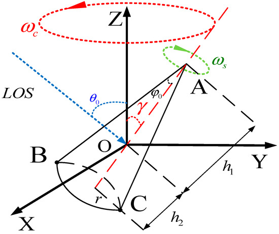 As shown in Figure 1, the system is the right-hand coordinate system. To facilitate analysis, the mass of the cone-shaped target is set at the origin of coordinate system. represents the cone rotation angular velocity, represents the spin angular velocity, and the elevation and azimuth angles of the target symmetry axis are and , respectively. The angle between the LOS and the axis is .