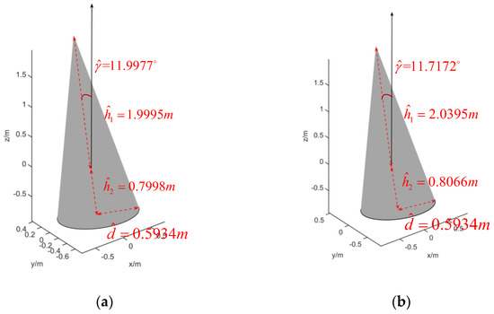 To achieve parameter estimation, the compensation coefficient is set as: , , and . As shown in Figure 8b, when the compensation coefficient , the value of normalized error reaches the minimum. This implies that the set of parameters at is the final parameter estimated value. Accordingly, the parameter estimation values of the cone-shaped target are , , , and .